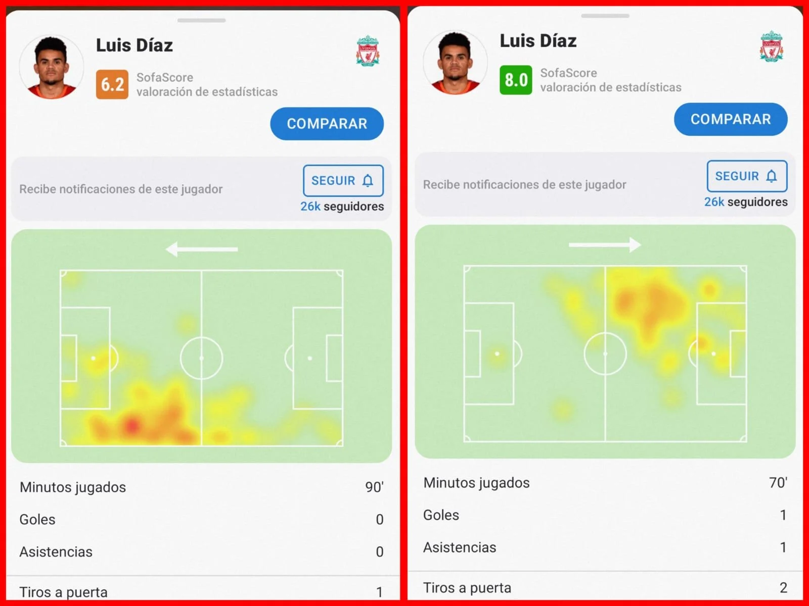 Ojo que no es una crítica para Lucho; juega de manera descomunal; creo que es de los jugadores con más presente y futuro de Sudamérica fuera de Brasil y Argentina, pero su desempeño es distinto y habrá que encontrar la forma de hacer que este nuevo engrane funcione. En la comparativa podemos ver que el primero tiene un ataque más cargado al centro y en el área, mientras que el colombiano lo hace en la periferia de esta y no con tanta profundidad.